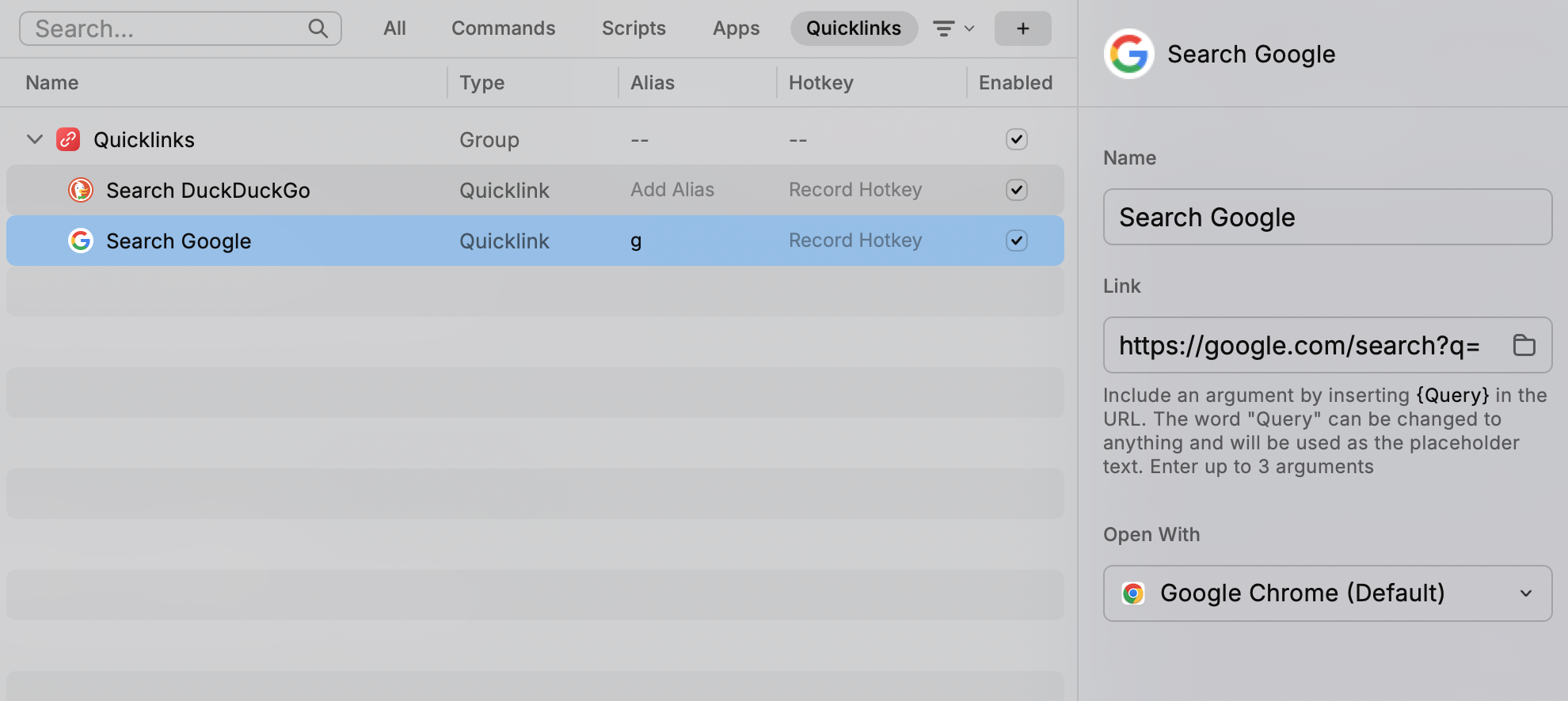 自分は、この機能に g というエイリアスを設定しており、Raycast を立ち上げ g {検索ワード} と入力することでブラウザで Google 検索を行えるようにしています。
