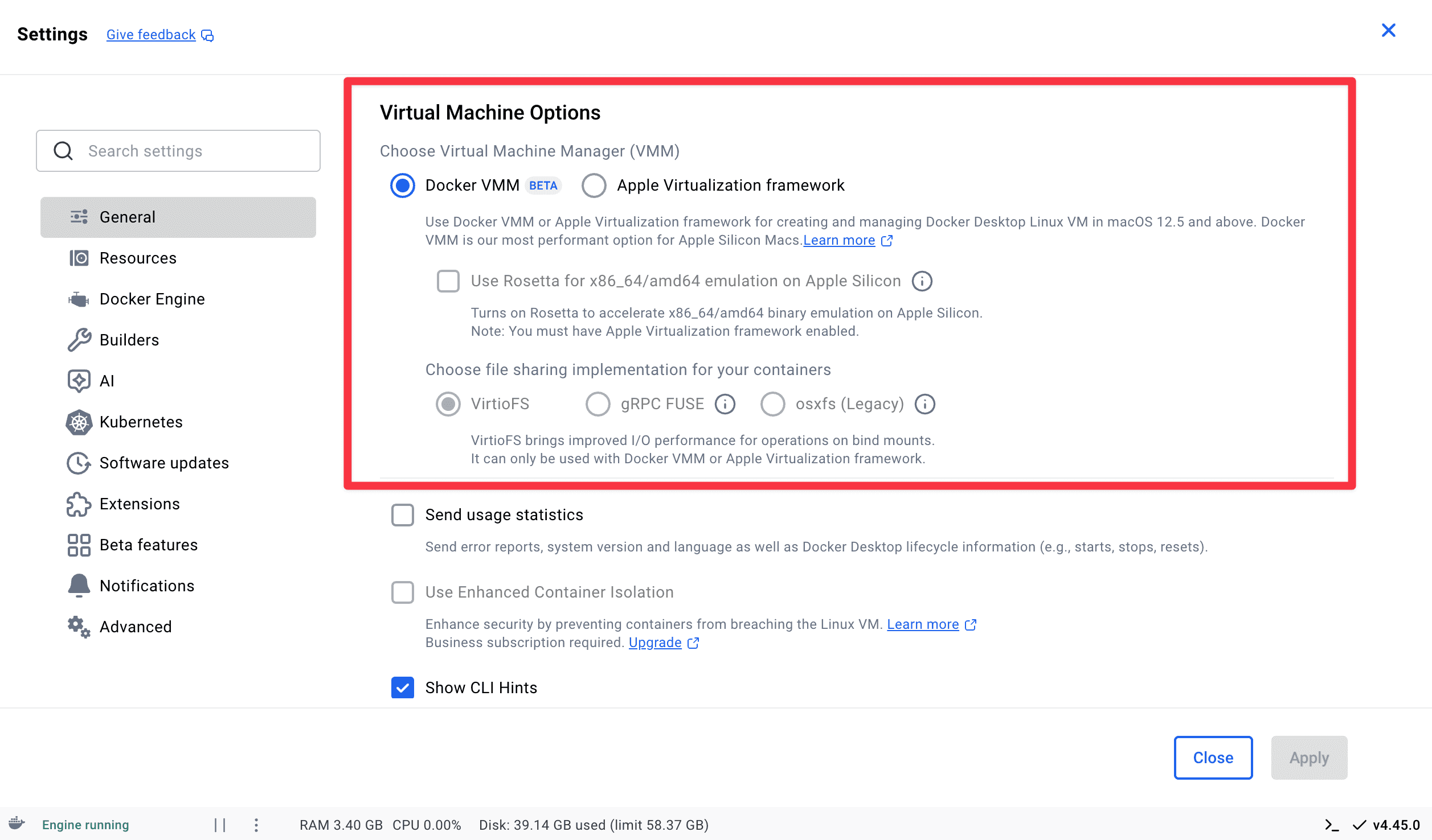 - 設定場所:Docker Desktop > Settings > General > Virtual Machine Options